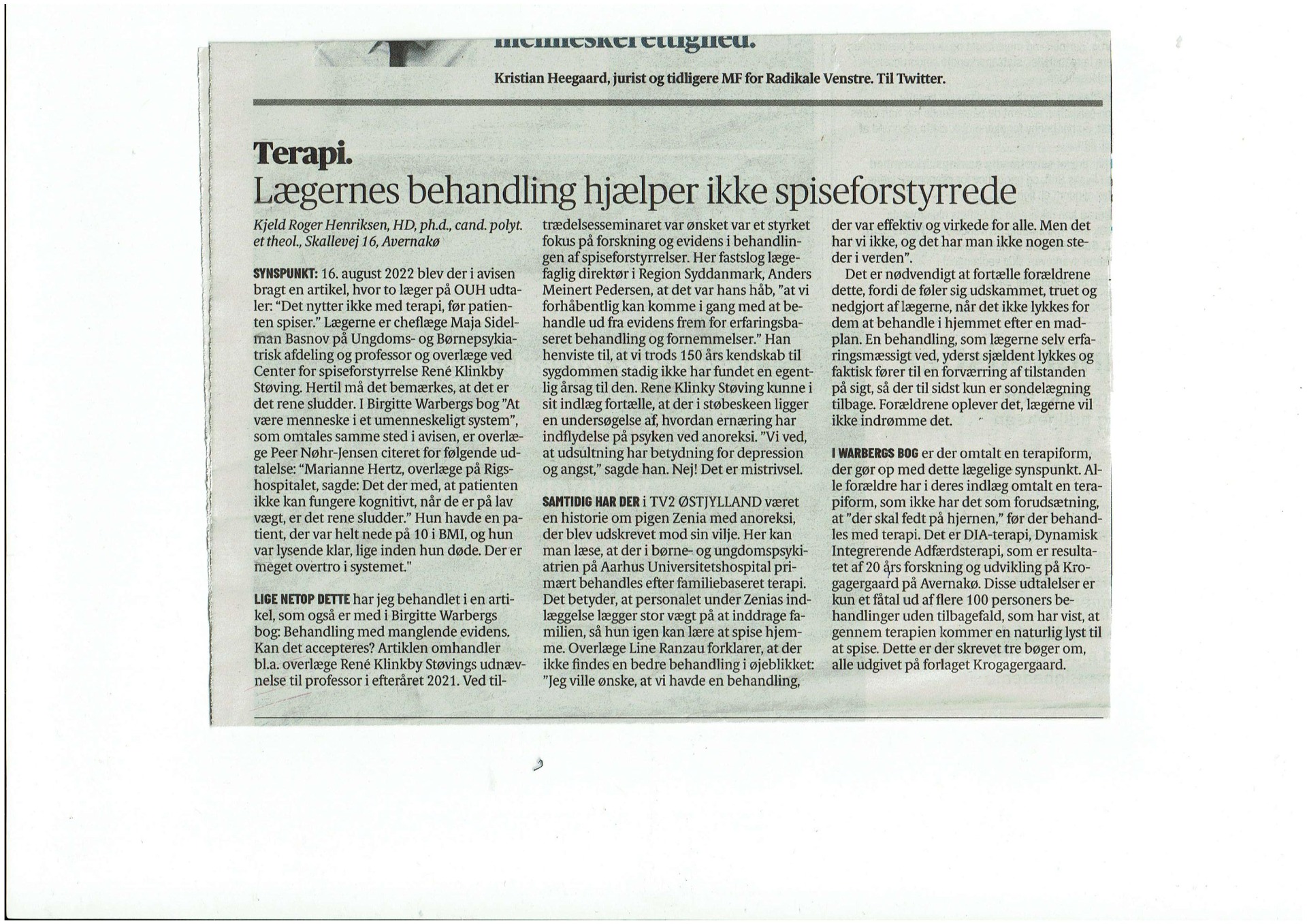 Indlæg Fyns Stiftstidende - Lægernes behandling hjælper ikke spiseforstyrrede