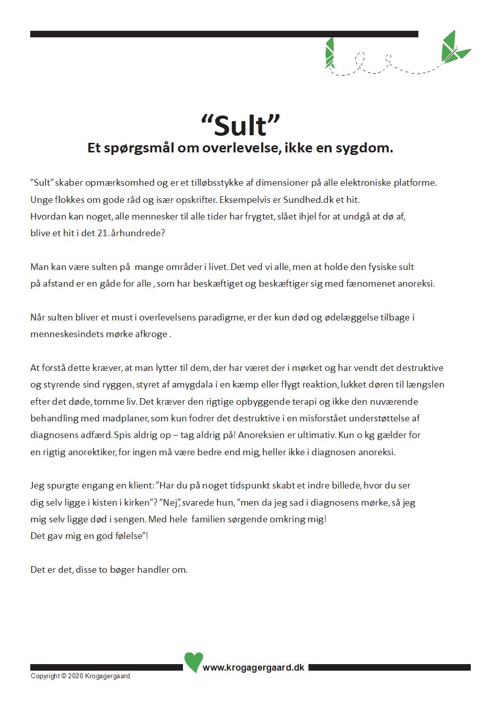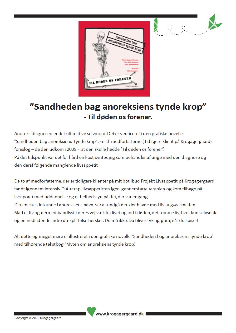 Det foranledigede mig sammen med nogle af mine klienter at skrive to bøger, som påpegede denne udsigtsløse behandling. På mit forlag Krogagergaard udgav vi derfor i 2009 to bøger med det samme tema ,som blev påpeget i OUH´s undersøgelse, nemlig at det ultimative mål er selvmordet. Til forskel fra hospitalet kunne jeg sammen med mine medforfattere anvise en effektiv terapi, som intet havde med mad at gøre, men kunne vise, at spiseforstyrrelsen ikke er en sygdom, men et valg til at løse et mentalt uløseligt problem, en tilstand af en ked.af-det-hed, som får den konsekvens for den diagnosticerede, at målet at forsvinde bliver det optimale i personens liv. Den, der dør i anoreksien, er vinder i den verden!